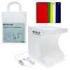 ShellMaterial: PVC Scenarios Material: EVA, non-woven Shell Color: White Color temperature: white Fresh, 2 * 5600 K Light source: 2 LED panels with 2 * 20 pcs beads on it bright: About 2 * 550 lumens Power Source: USB 5 V port: Micro USB, universal Android device port Rated Power: 2 * 3.5 W Size of the tent: About 24x23x22 cm / 9.4x9x8.6 “(unfolded) 23x23x1.5 cm / 9x9x0.59 “(folded) attention please wait 3-5mm size deviations due to manual measurement. Package Included 1 x Main Studio Box (with 2 LED panels) 1 x Round PVC Plate 1 x Soft Bag 6 x EVA Scenarios (6 different colors) 1 x Micro USB Cable 1 x User Manual