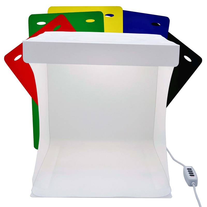 characteristics 100% Brand new! all-in-one portable studio, easy to use & take apart. the photo lightbox is designed for small items of photography enthusiasts, artisans, artists, students, and other online sellers, professionals, and product advertising clients. studio lightbox allows quick and easy shooting of small products such as jewelry, accessories, toys, watches, appliances, and other items. set up your own photography studio anywhere in a matter of minutes, you can unfold this has taken light studio box and put it on any surface to get the perfect setting for small business photography articles, take pictures for them. portable snap button snap frame design, easier to install and carry, built-in led light, medium-light supply and prevents shadows and reflections on your photos. with 6 EVA bottoms (Black, white, orange, red, green, blue), and internal LED light panel and USB cable (you should prepare a USB charger, power bank, or USB hub to power it ). Mini and light weight, just like a book when folded, easy to take anywhere.